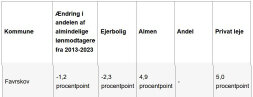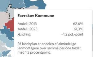 I Favrskov er andelen af almindelige lønmodtagere i egen ejerbolig kun faldet med 2,3 procentpoint. Andelen af almindelige lønmodtagere i Favrskov er i den 10-årige periode faldet med 1,2 procentpoint.