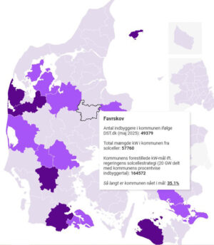 Baseret på mængden af indbyggere er Favrskov Kommune, med 57.760 kW solcellekapacitet, nr. 26 i landet.