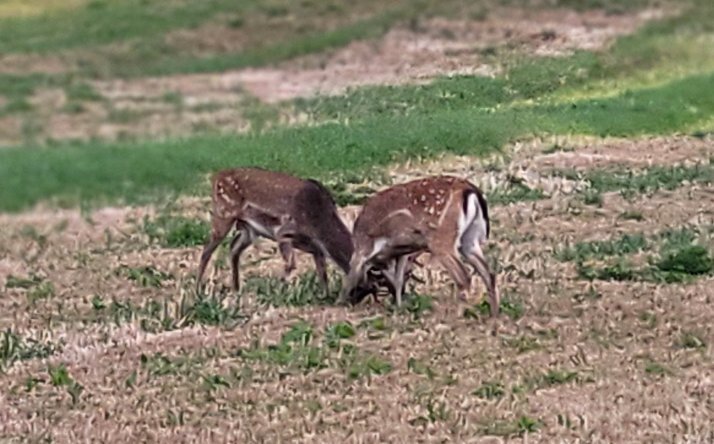 På en mark var to unge dåhjorte oppe at slås, og jeg var så heldig, at jeg fik det foreviget på video. Følg dette link: https://photos.app.goo.gl/EaUCbxwA7u67JjU28