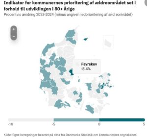Ældreområdet halter efter Ældre Sagen har opstillet en indikator for, hvordan ældreområdet bliver prioriteret i forhold til kommunernes samlede udgifter. Og billedet er klart: I 92 ud af 98 kommuner faldt prioriteringen af ældreområdet fra 2023 til 2024. I Favrskov Kommune var faldet på 8,4%.