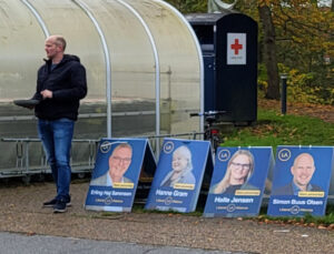 Bla til et gadearrangement i Hadsten stod Simon B. Olsen og Erling Høj nede ved Kvickly, mens LA med de øvrige kandidater havde en stor stand oppe øverst i Søndergade.