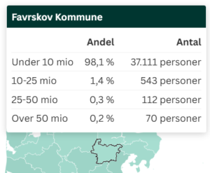 Svar: Hvis formuegrænsen er mindst 25 mill. kr. er svaret 182 personer eller 0,5 pct. af Favrskovs indbyggere:
