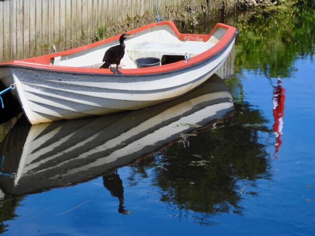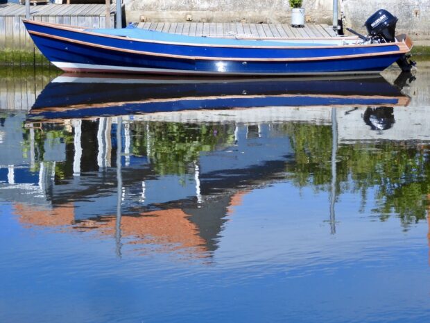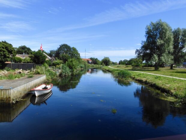 Huse og både spejler sig i åen på flotteste vis 🥰
