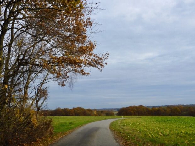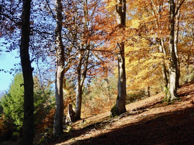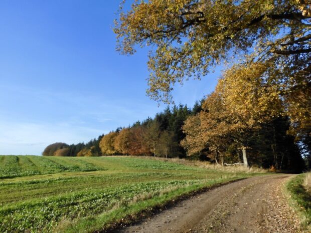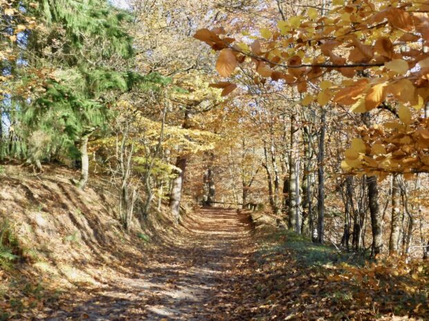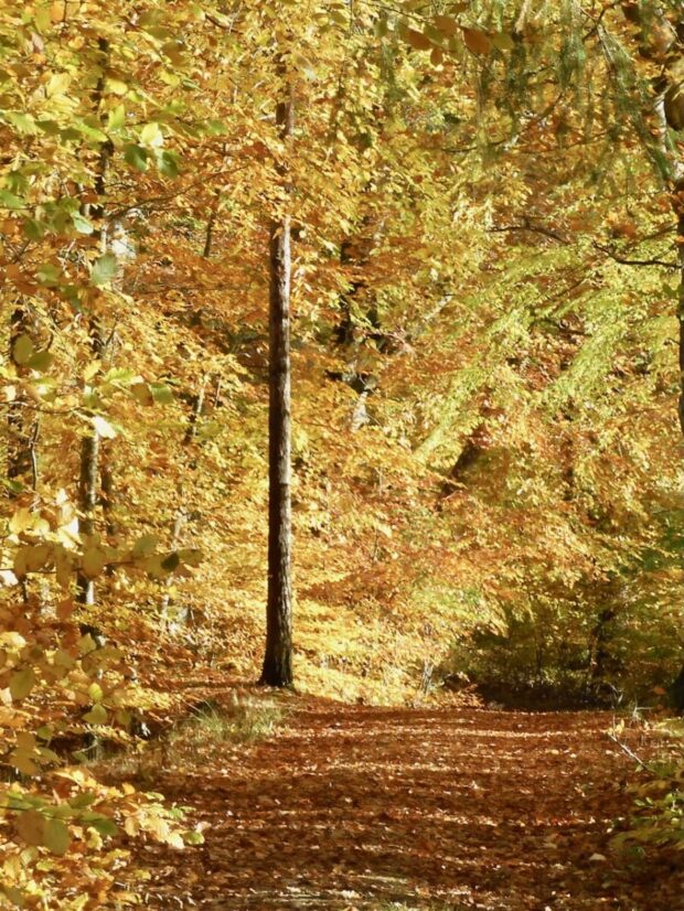 Der er efterhånden tyndet så meget ud i bladene, at sol og skygger igen falder flot her på skovvejen.