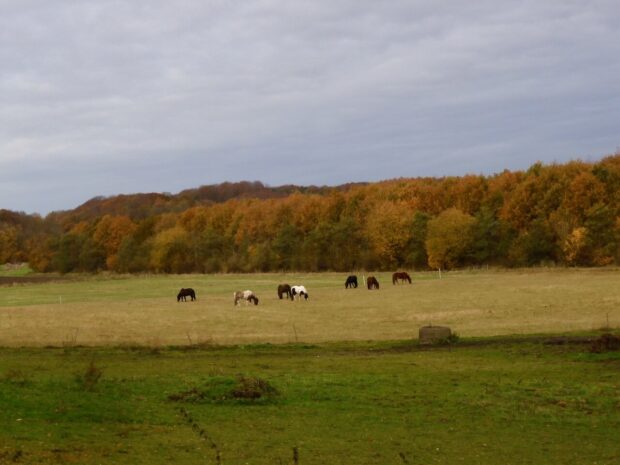 Udsigt fra Hammelvej ned mod Rækkevej. Flotte farver mod den grå himmel.