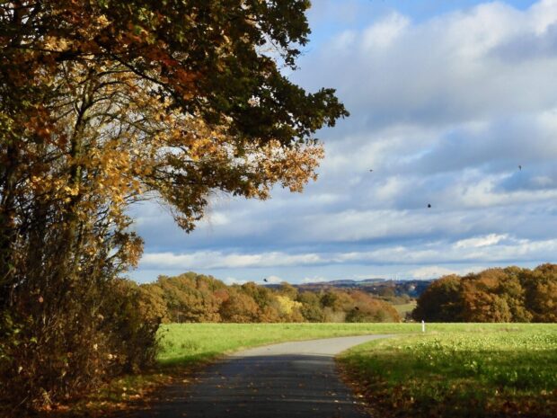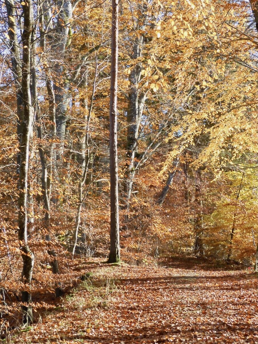 Der er efterhånden tyndet så meget ud i bladene, at sol og skygger igen falder flot her på skovvejen.
